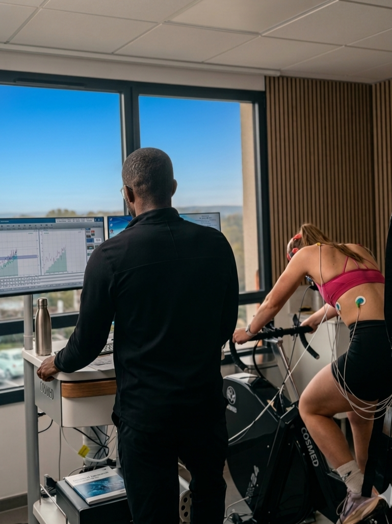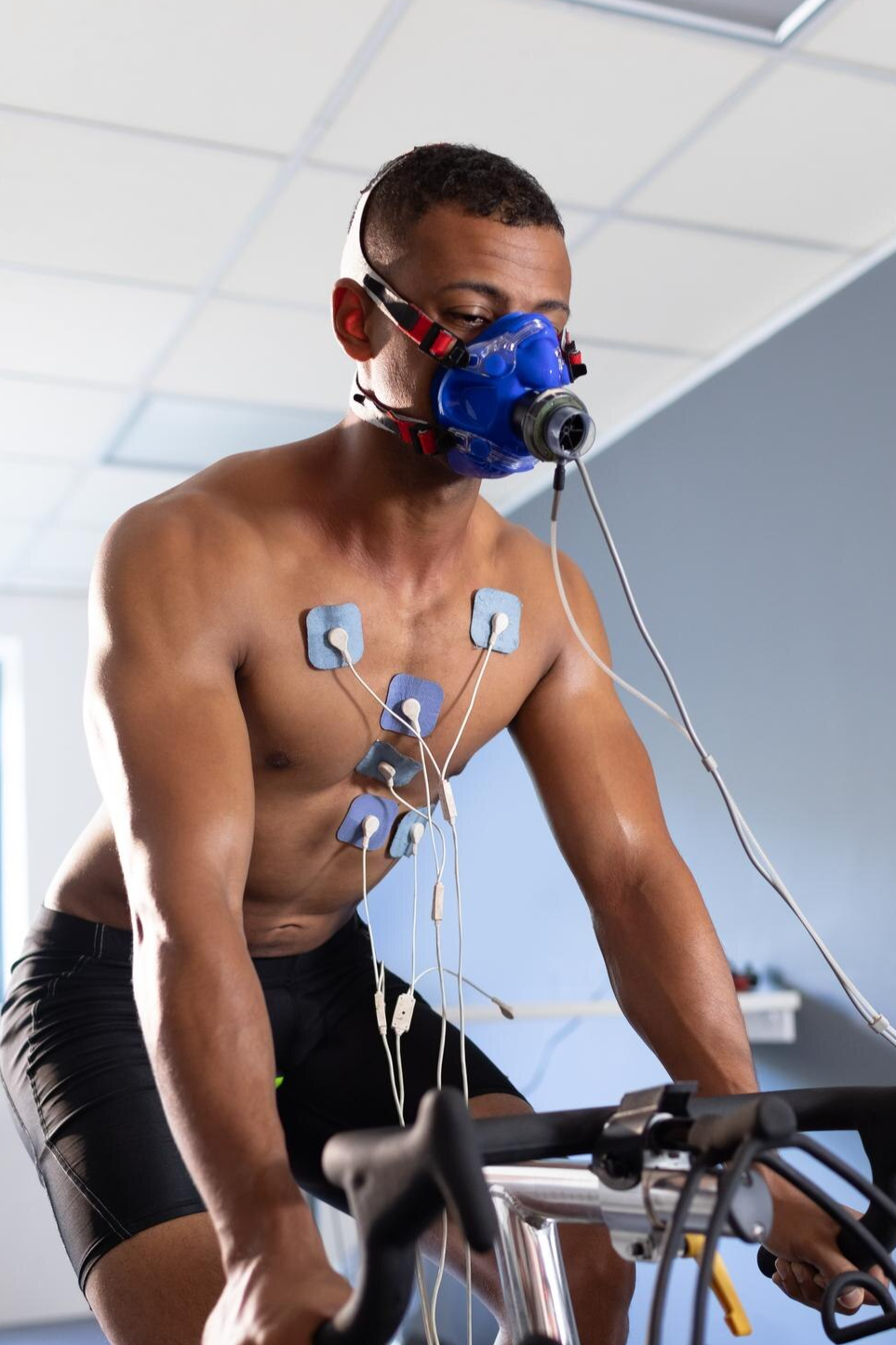 Le test VO2max est réalisé sur vélo ergométrique avec port d'un masque facial permettant l'analyse continue des échanges gazeux. L'effort est progressif et encadré par un protocole médical standardisé. Tout au long de l'examen, un cardiologue assure la surveillance électrocardiographique en continu, garantissant la sécurité du patient à chaque étape. Les résultats sont analysés et remis en fin de consultation, accompagnés de recommandations personnalisées.